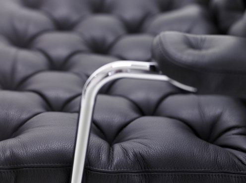 Der Sessel Karin aus dem klassischen Bruno Mathsson-Designsortiment bietet mit seinem fein verchromten Rahmen und der gesteppten Polsterung eine elegante Sitzgelegenheit.