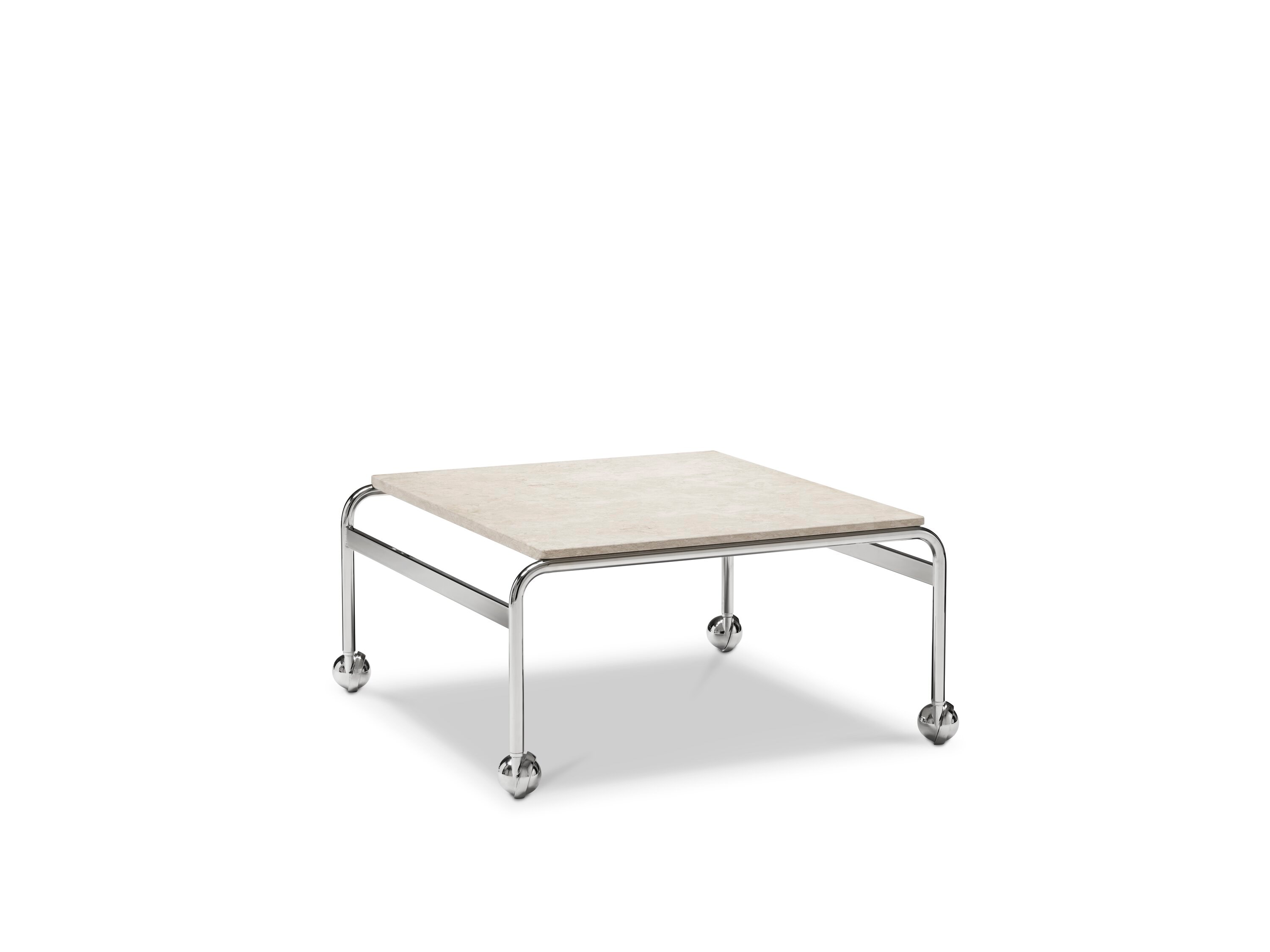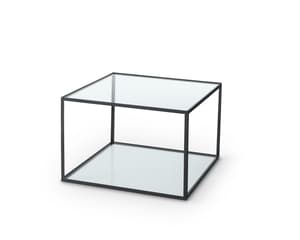 Ein klassischer Tisch mit quadratischer Form in einer verchromten Ausführung oder aus schwarzem Metall, mit einer Platte und Unterseite aus Glas.